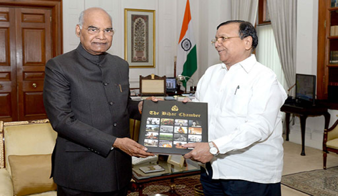 A delegation of Bihar Chamber of Commerce and Industries met with Hon'ble Deputy Chief Minister-cum-Revenue & Land Reforms and Mines & Geology Minister Shri Vijay Kumar Sinha on courtesy visit at his residential office and presented him a bouquet and a shawl.