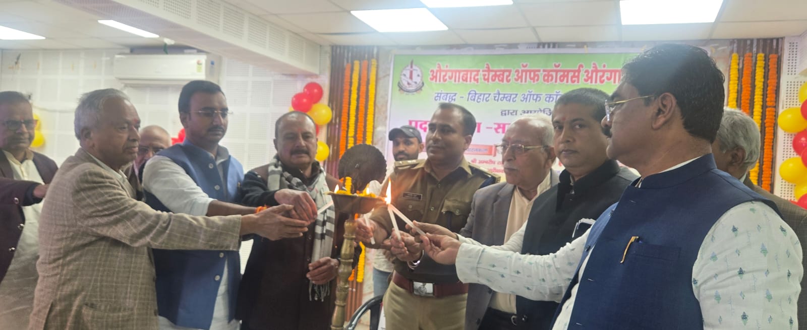 Aurangabad Chamber of Commerce Aurangabad organized a Foundation-cum-Felicitation Ceremony. On behalf of Bihar Chamber of Commerce and Industries Former President Shri Subhash Kumar Patwari, Former Secretary General Shri Pashupati Nath Pandey and Chairman of the Organization Sub-Committee Shri Ajay Gupta attended the programme as Special Guests. Chief Guest-cum-Inaugurator Shri Ambrish Rahul,IPS Superintendent of Police, Aurangabad, Shri Subhash Kumar Patwari, Former President of Bihar Chamber, Former Secretary General Shri Pashupati Nath Pandey and Chairman of the Organization Sub-Committee Shri Ajay Gupta inaugurate the programme by lighting the lamp.