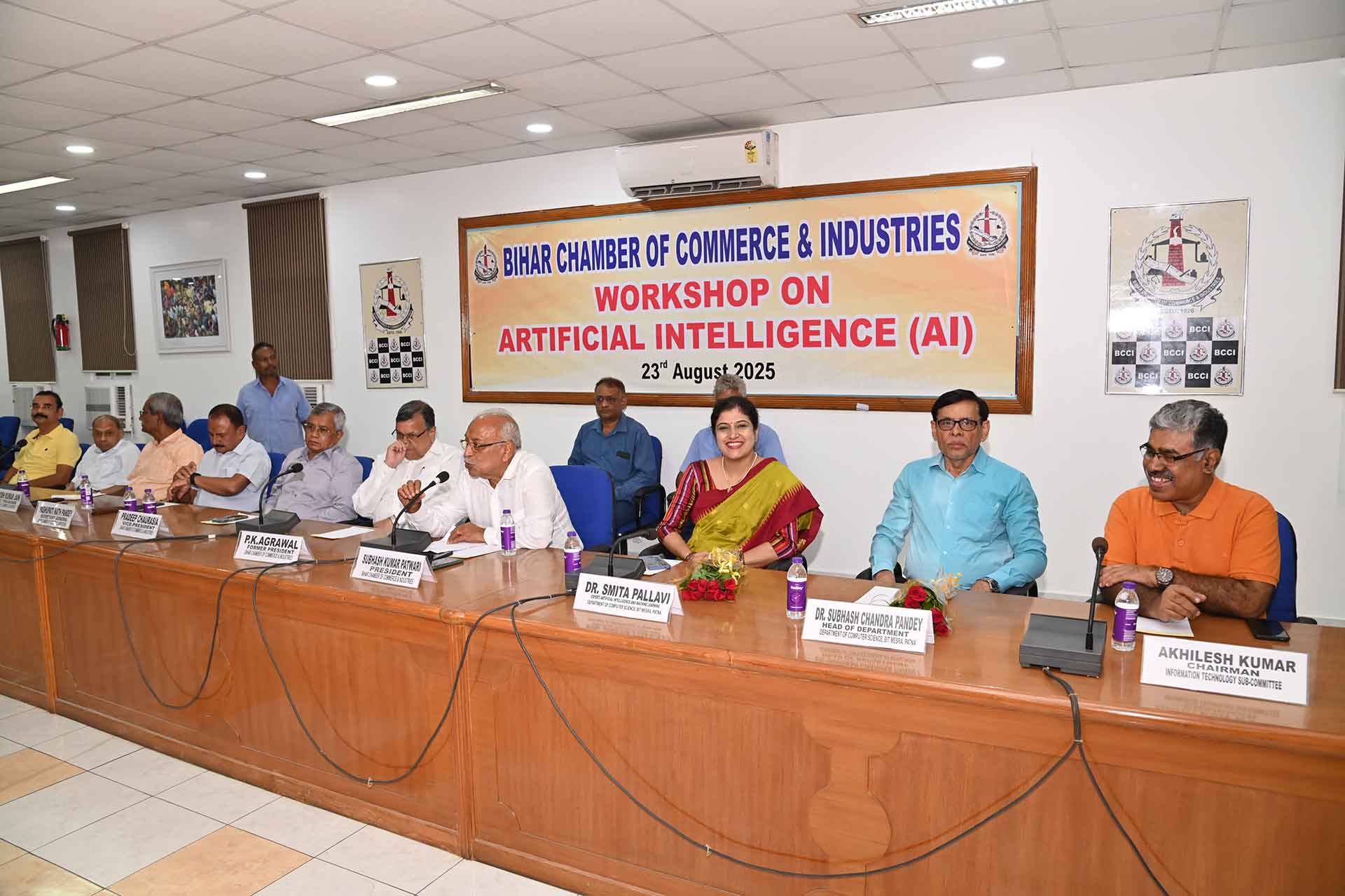 A workshop on Artificial Intelligence (AI) was organised by the Bihar Chamber of Commerce and Industries. Chamber President Shri Subhash Kumar Patwari on the dias. on his left, Artificial Intelligence (AI) expert from BIT Meshra, Dr. Smita Pallavi, Dr. Subhash Chandra Pandey and IT Sub-Committee Chairman Shri Akhilesh Kumar. On his right Former President Shri P.K. Agrawal, Vice president Shri Pradeep Chaurasia, Secretary General Shri Pashupati Nath Pandey, Hony. Treasurer Shri Subodh Kumar Jain, Former Secretary General Shri Raja Babu Gupta and Former Vice President Shri Mukesh Kumar Jain.