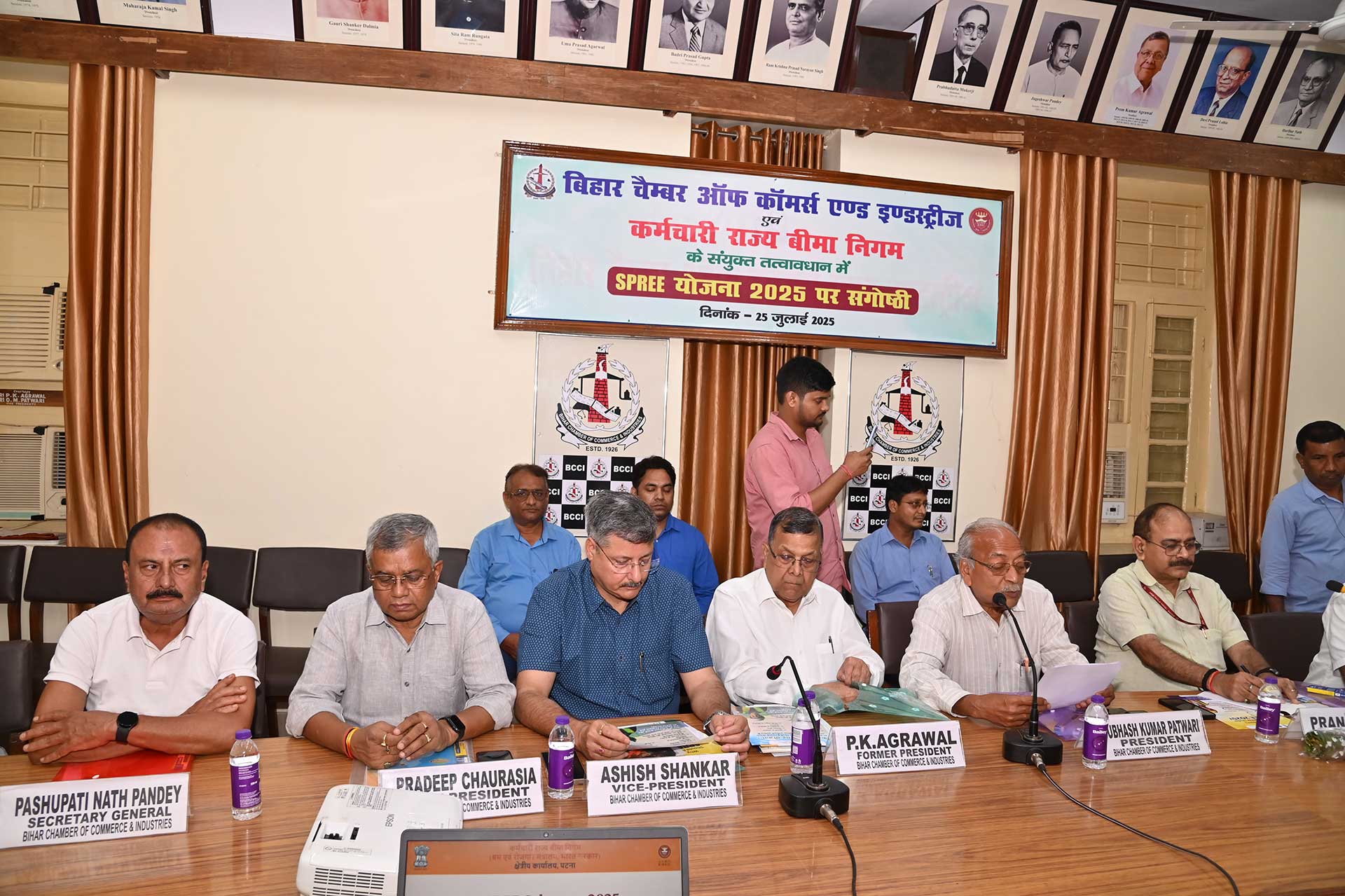 Bihar Chamber of Commerce and Industries in collaboration with Employees State Insurance Corporation (ESIC) organized a seminar on SPREE- 2025 (Scheme to Promote Registration of Employers/ Employees) Scheme in the Chamber premises. Chamber President Shri Subhash Kumar Patwari seated on the dais in the programme. On his left are ESIC Insurance Commissioner Shri Pranay Sinha and Deputy Director Shri R. R. Tiwari respectively. On his right are Former President Shri P. K. Agrawal, Vice Presidents Shri Ashish Shankar and Shri Pradeep Chaurasia and Secretary General Shri Pashupati Nath Pandey.