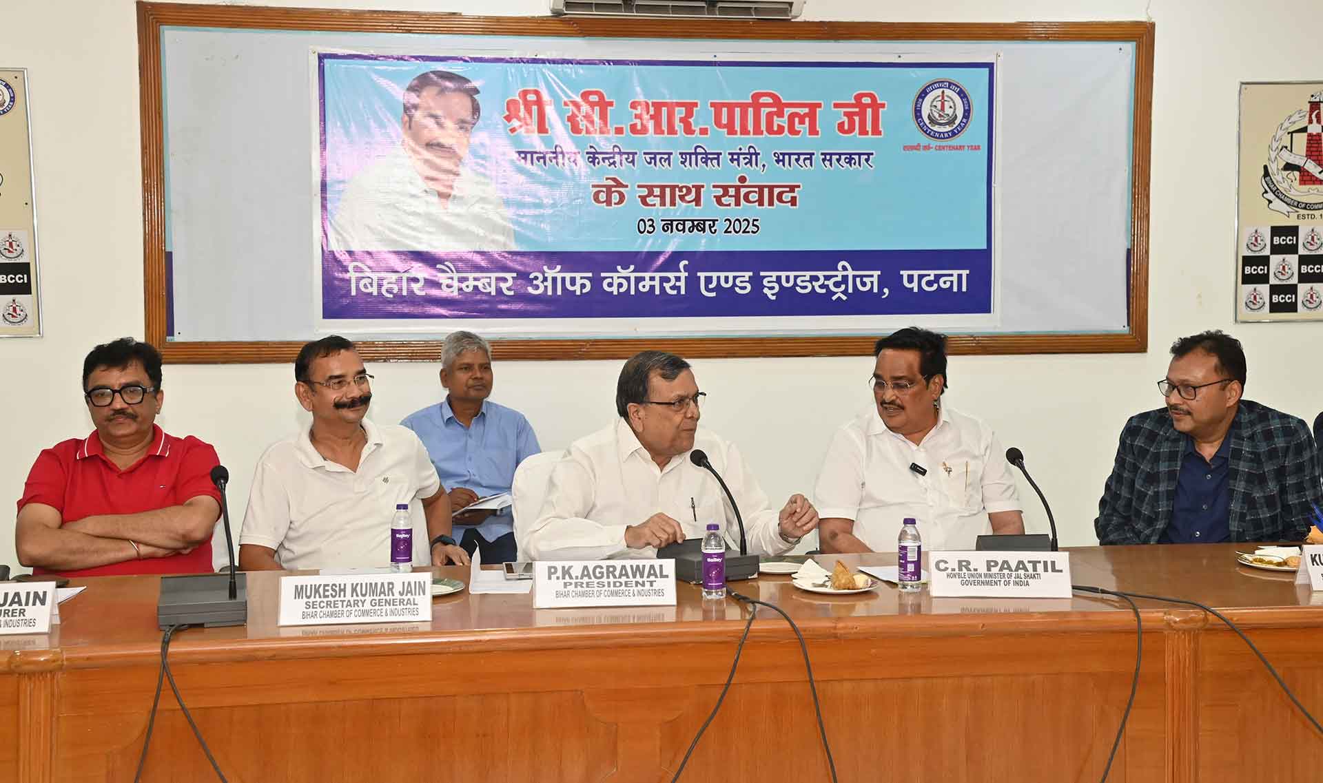Bihar Chamber of Commerce and Industries organized a meeting with Hon'ble Union Jal Shakti Minister Shri C.R. Patil at the premises of Bihar Chamber. Chamber President Shri. P.K. Agrawal was present on the dais in the meeting. On his left are the Hon'ble Union Jal Shakti Minister Shri C.R. Patil and The Director, South Gujrat Textile Processors Association, Shri Kunj Bihari Sultania. On his right are Secretary General Shri Mukesh Kumar Jain and Hony.Treasurer Shri Rajesh Jain respectively.