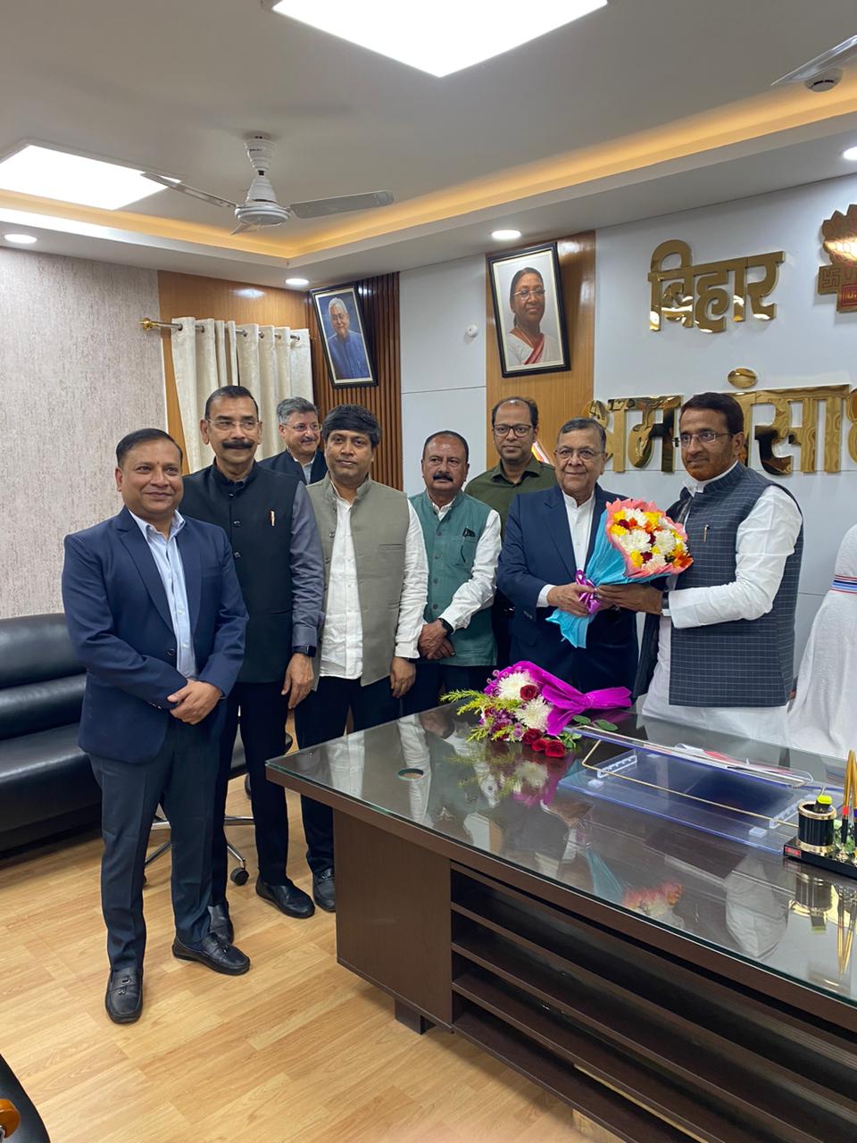 A delegation of Bihar Chamber of Commerce and Industries met the newly appointed Hon'ble Labour Resources Minister Shri Sanjay Singh Tiger in his office and congratulated him on becomings the Labour Resources Minister of Bihar by presenting him a bouquet and a shawl.
